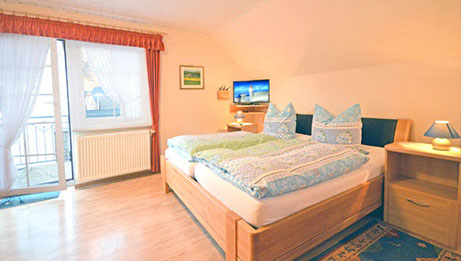 Unsere Ferienwohnungen laden mit überdachten Balkonen zum Frühstück mit Weitblick ein. Die 50 qm-Wohnung bietet eine Küchenzeile, die 30 qm-Wohnung eine Kitchenette – beide mit WLAN, TV, Terrasse/Balkon, Bettwäsche und Handtüchern.